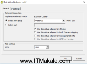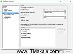 Burada dikkat edilecek nokta herbir vMotion port tanımına bir adet network uplink portu ve IP set edilmelidir.Portlardan biri Active olarak set edilmişken diğeri Standby olarak kullanılacaktır.